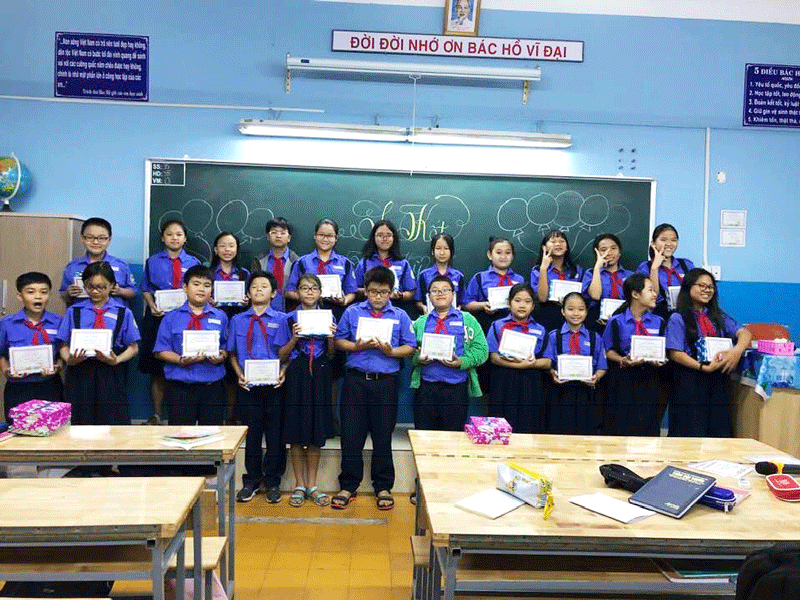 Các em học sinh nhận phần thưởng trong dịp sơ kết lớp năm học 2018 - 2019